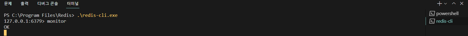 vscode에서 터미널을 추가하여 redis 설치폴더인 c:\program Files\Redis로 이동해 줍니다. redis-cli.exe를 실행시킨 후 monitor을 입력하여 모니터링 상태로 변경해 둡니다.
